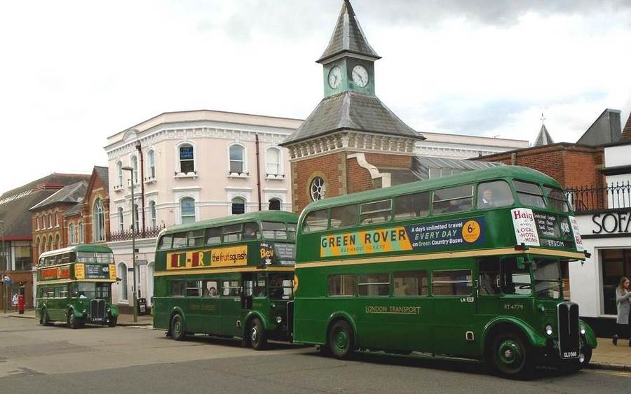 Green RTs returned to the 408 on 30 September 2018. The location is North Street, Guildford, and the white building on the right is the former Horse & Groom, original terminus of the 408 in the days of STLs before the first bus station was build in the town. The pink building is the Guildford Institute, home of an important local history library, and the clock tower is on the old fire station; both these locations also being former bus terminal! RTs 3148 and 4779 had run in from Chelsham, whilst RT3491 worked a short from Epsom.